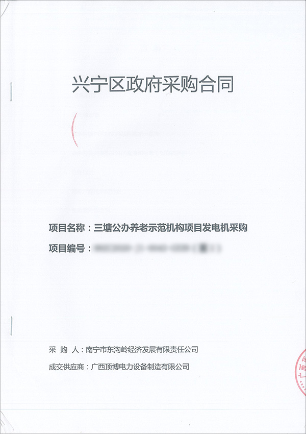 近日,廣西頂博電力設(shè)備制造有限公司與南寧市東溝嶺經(jīng)濟(jì)發(fā)展有限責(zé)任公司根據(jù)2020年11月6日南寧興寧區(qū)政府采購(gòu)項(xiàng)目的采購(gòu)結(jié)果成功簽署了一臺(tái)100KW柴油發(fā)電機(jī)組采購(gòu)合同,據(jù)了解,該臺(tái)機(jī)組將作為應(yīng)急備用電源用于三塘公辦養(yǎng)老示范機(jī)構(gòu)項(xiàng)目。